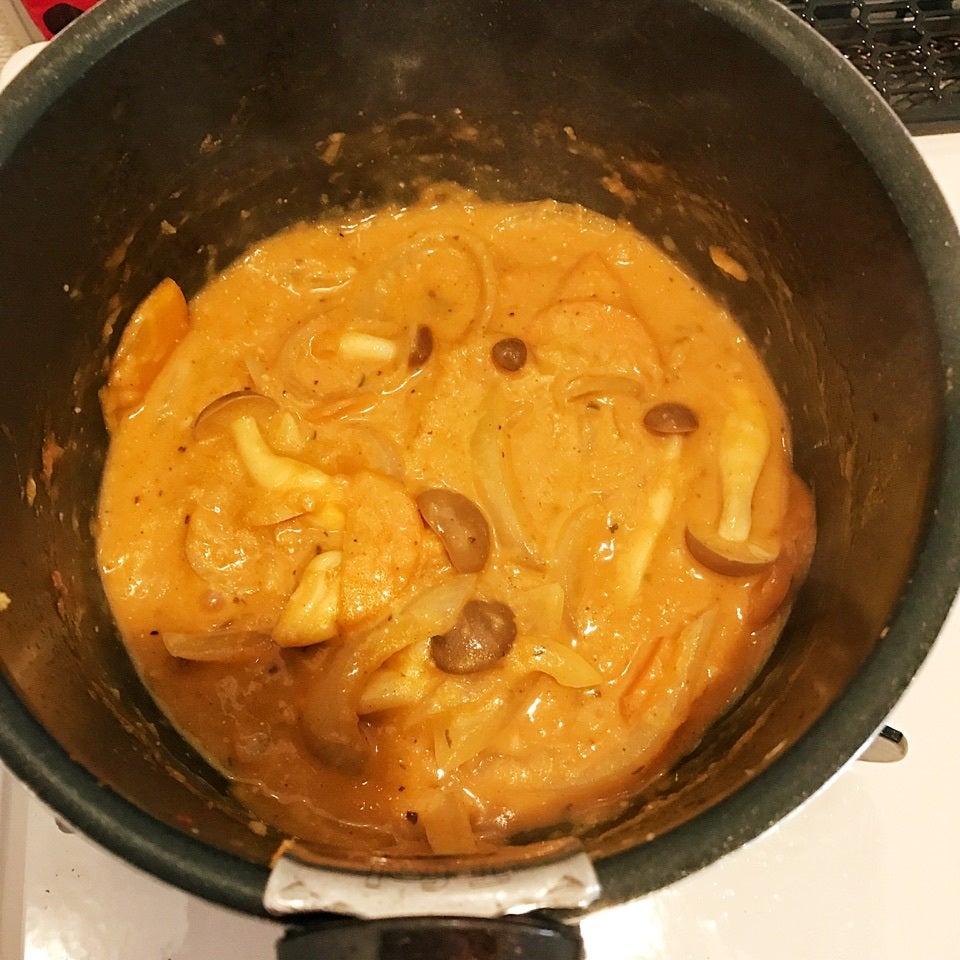 バターで玉ねぎ人参とすりおろし野菜炒めて、小麦粉カレー粉炒めて