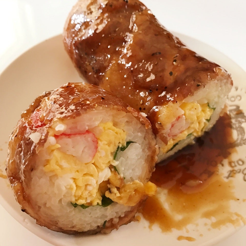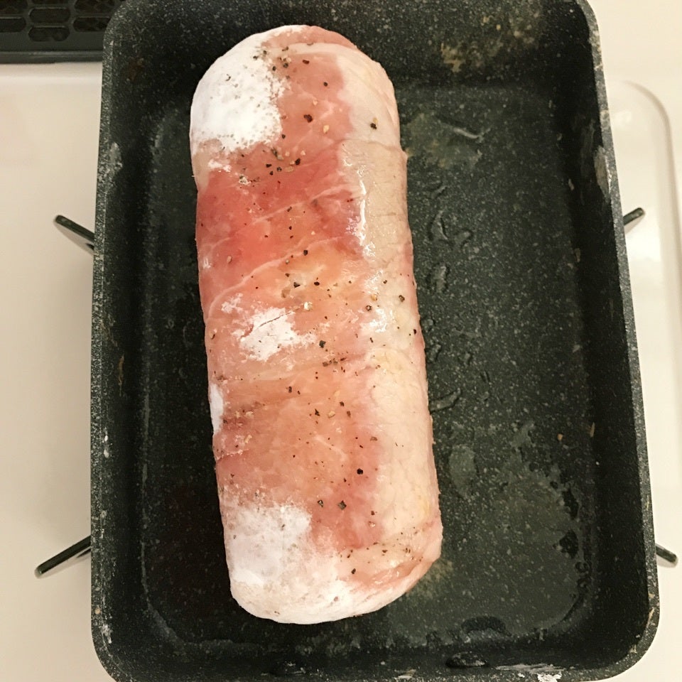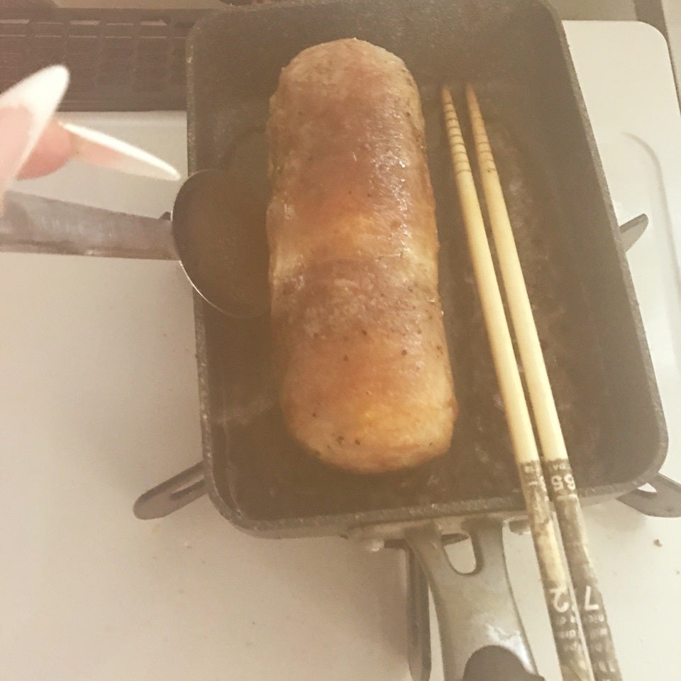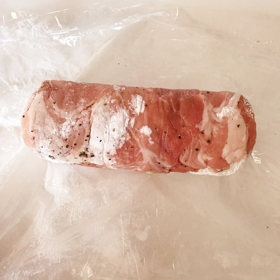 ロース肉一枚を半分個したものをくっつけて巻いていきます♪