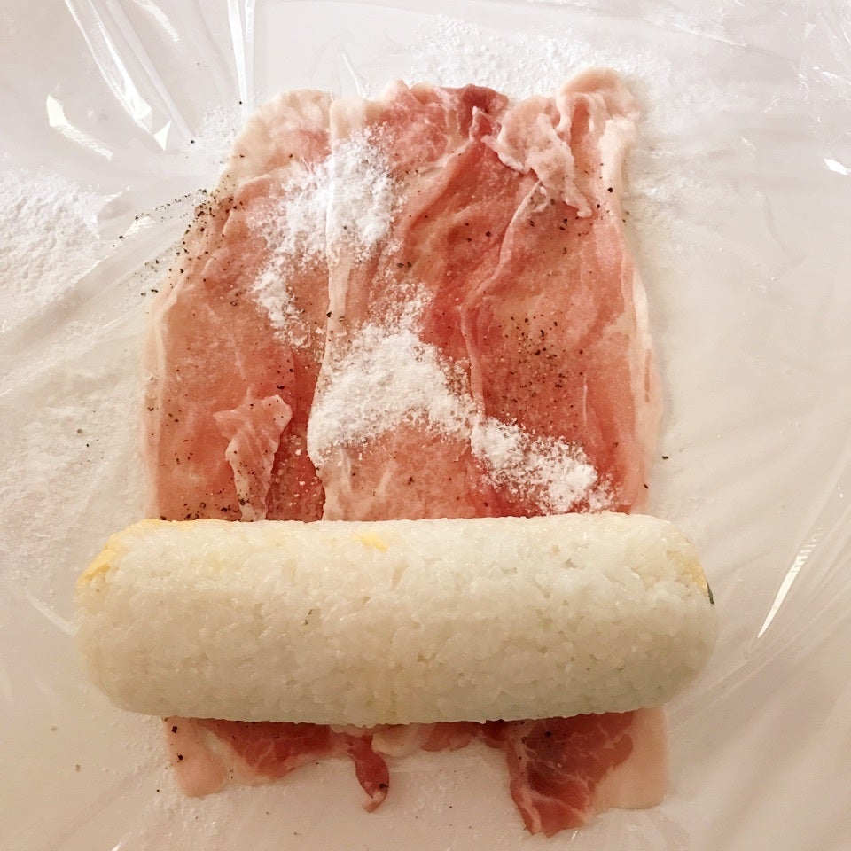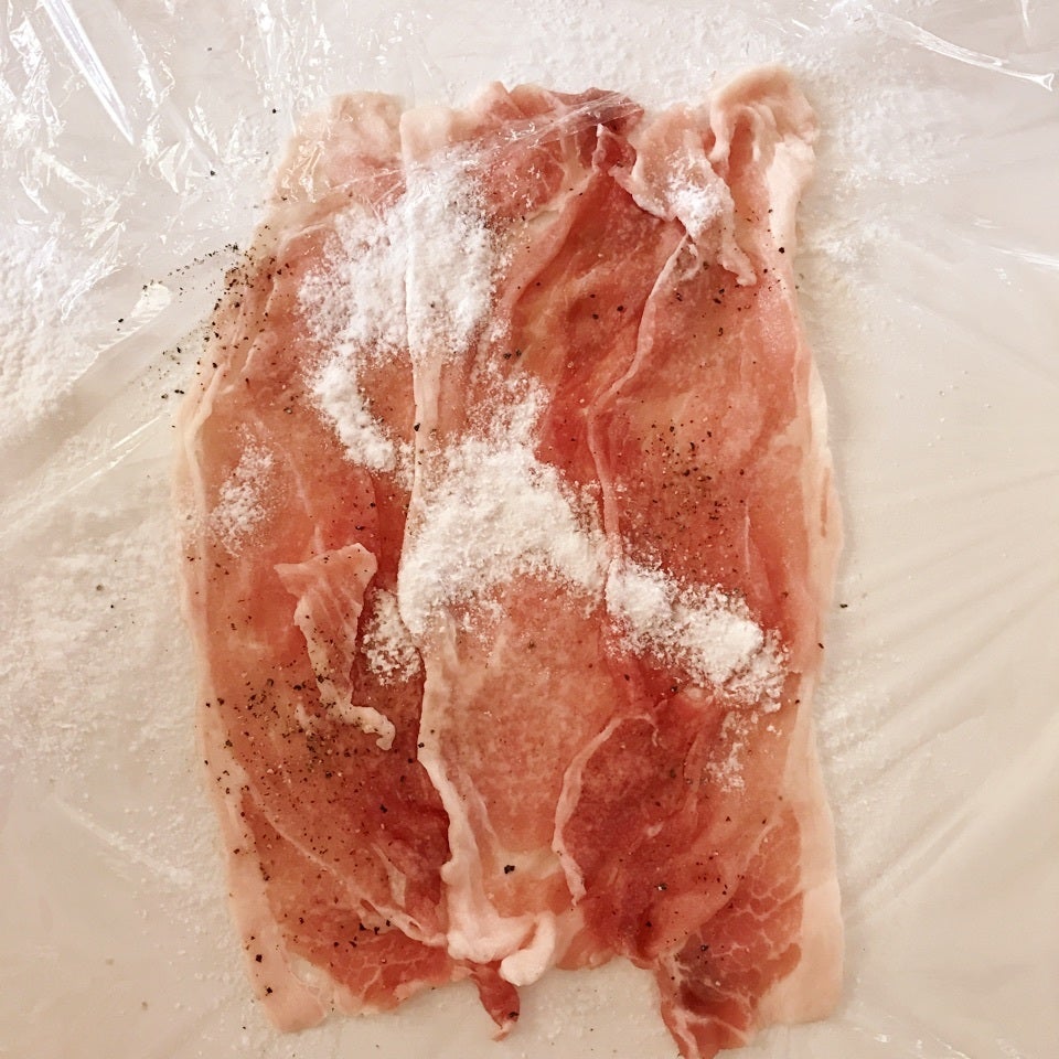 豚ロース薄切り3枚を並べ塩コショーと片栗粉をふっておく。