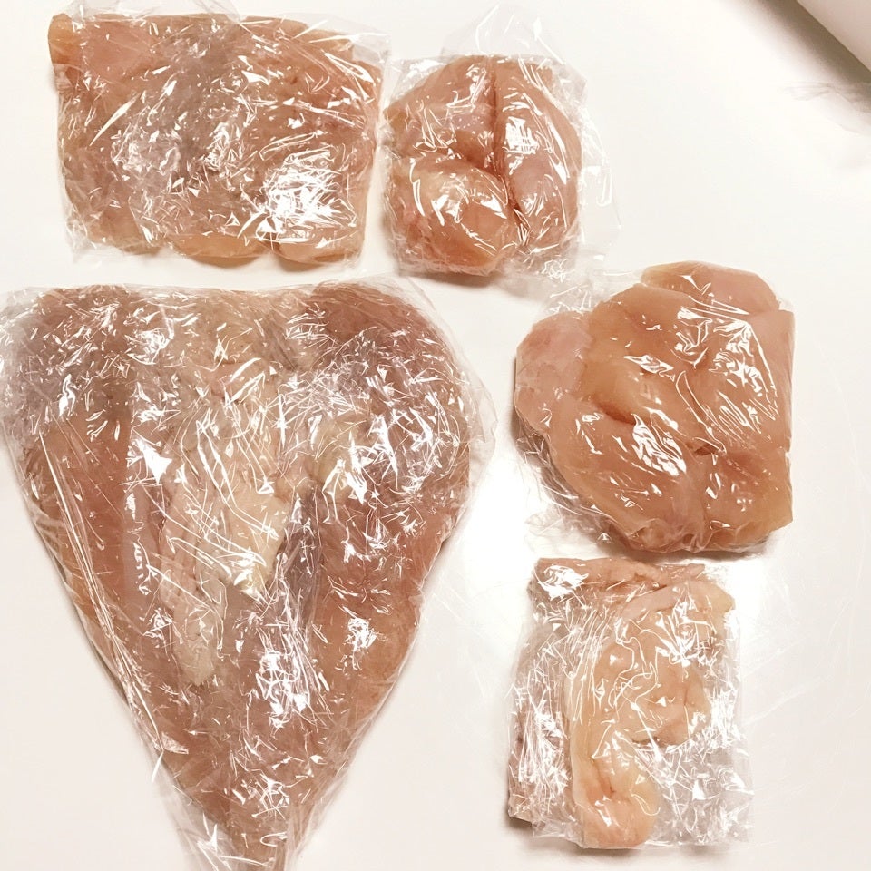 昨日買った鶏胸肉グラム58円のこはこんな感じに分割されて冷凍庫へ〜