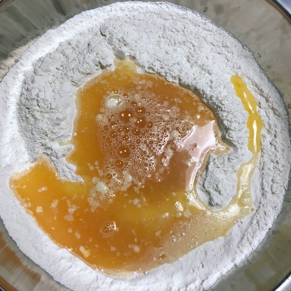 強力粉&薄力粉の中心をくぼませて、そこに★の水〜卵の液を流し入れたら混ぜ合わせる。