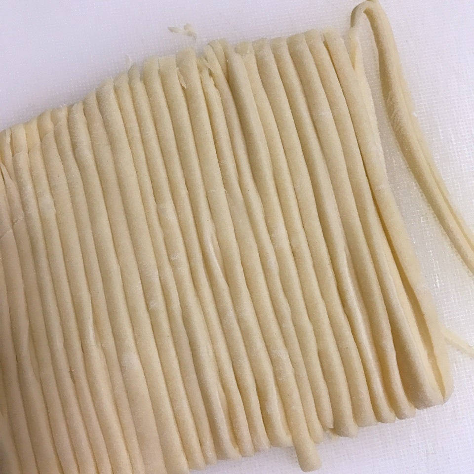 5〜6等分して、片栗粉で打ち粉をして1〜2ミリの厚さに伸ばし、片栗粉をたっぷり振って三つ折り(屏風だたみ)にしたらお好みの太さに切っていきます。