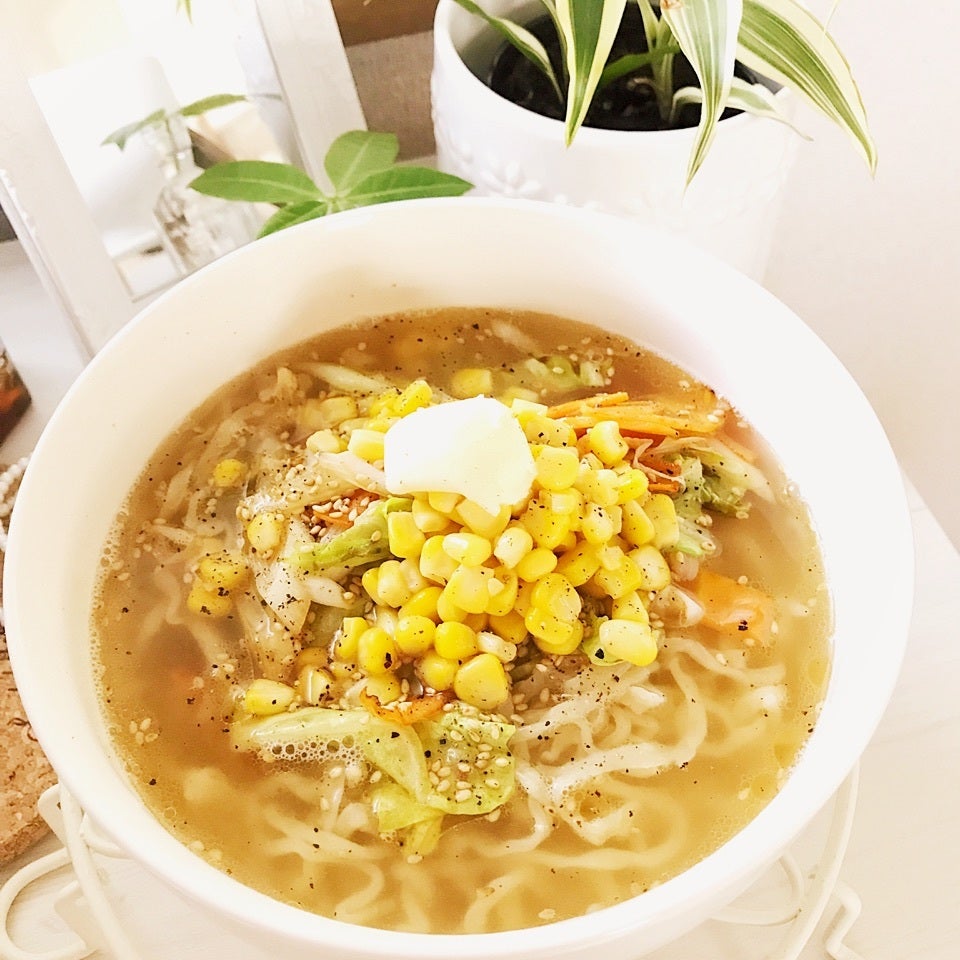 ごま油で炒めた野菜とコーンバターのっけ(*´﹃`*)朝から疲れました