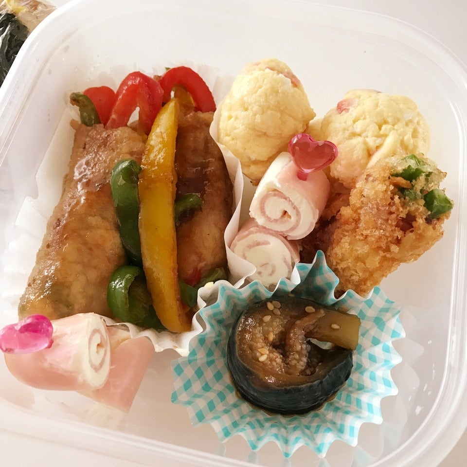 赤・黄パプリカとピーマンを豚ロースで巻いて