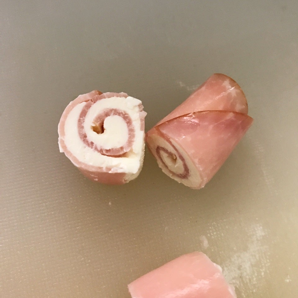 ハムの上にキリクリームチーズをのっけて、ラップをかぶせてめん棒でぐりぐり♪