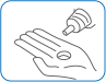 ①レンズの凹面を手のひらの上にのせ、本剤を適量たらします。