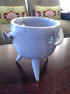 出来ました♪先日作成した花器が仕上がってまいりました♪(先生☆ありがとうございました)←こんな感じ3本の脚に支えられた花器です。今にも動き出しそうな感じを出したかったのですがいかがでしょう?穴が2つ。ここから花をのぞかせたり・枝を出したり・なんて想像しながら作ってみました~これに花を活けたらまたご紹介しま~す