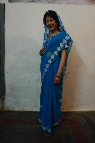 サリーをはじめてきました(結婚式使用だそうです。。。口紅の色濃すぎ)