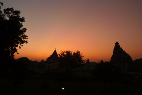 夕暮れに映るカジュラーホー寺院群