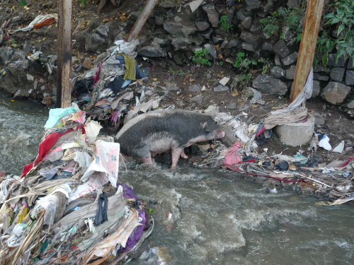 大きな豚とグレーの水と大量のゴミの川?それともドブ?
