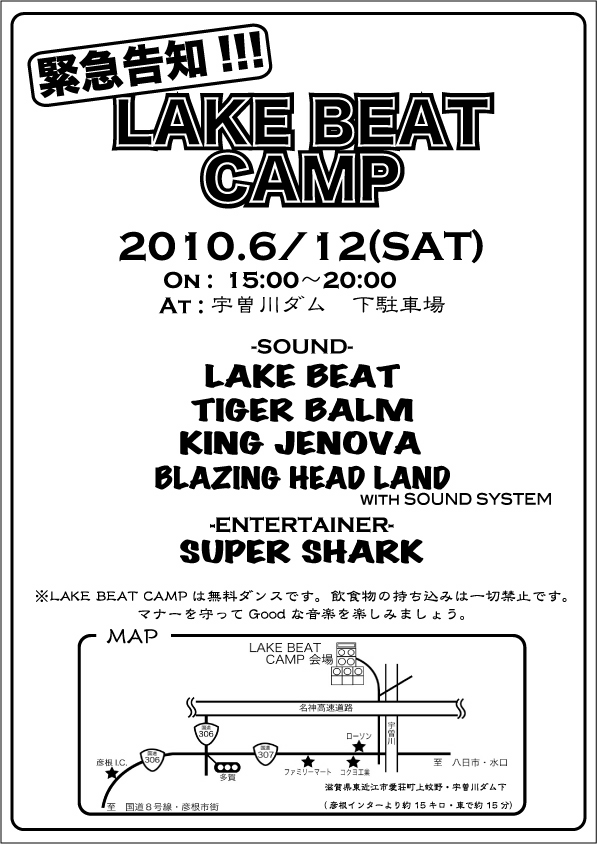 今週末。先日の告知通り、6/12(土)に開催します、『LAKE BEAT CAMP』ですが、もしも雨天中止ならばこのBLOGやMIXI-LAKE BEAT COMMUNITY-内にてお知らせします!!雨の降らないことを祈って、今週を乗り切りましょう!!!CHECK THIS AGAIN~~~~~!!!!!!ブリッツ!!!