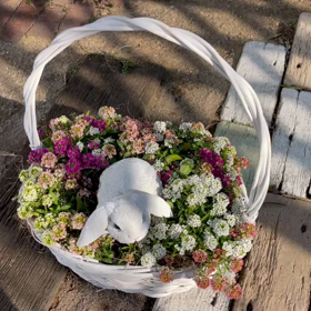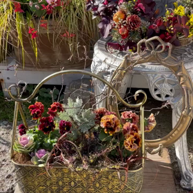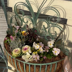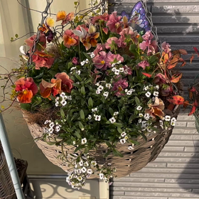 映り込む背景で違う!壁掛けバスケットにピンクビオラのパステル色寄せ植え