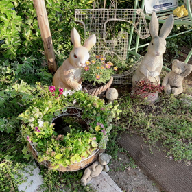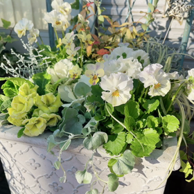 冬の西陽は優しいあったか色のお庭になる♪パステルホワイト寄せ植えコーナー