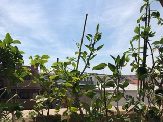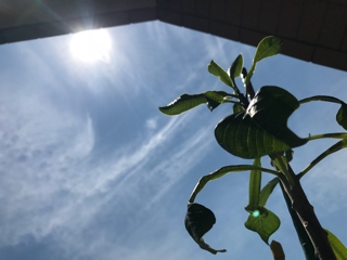 小春日和 今日も穏やかな小春日和になりました。洗濯物も早く乾きそうです。 もう5月も半ば過ぎたので室内で育てていた、プルメリアとティリーフとモンステラをベランダに出しました。でも、ちょっとした不注意でプルメリアの葉を落としてしまいました(^^;) 背が伸びると周囲にも目配り必要ですね。(^^;) 剪定したハイビスカス達も新しい芽を出してます。さて、どれが一番咲きするのでしょうか? では、また。