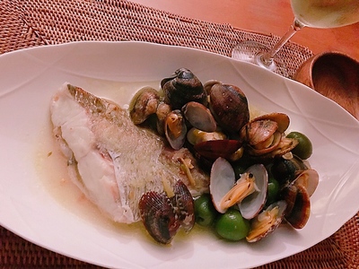 鯛とアサリと新摘みオリーブの白ワイン蒸し