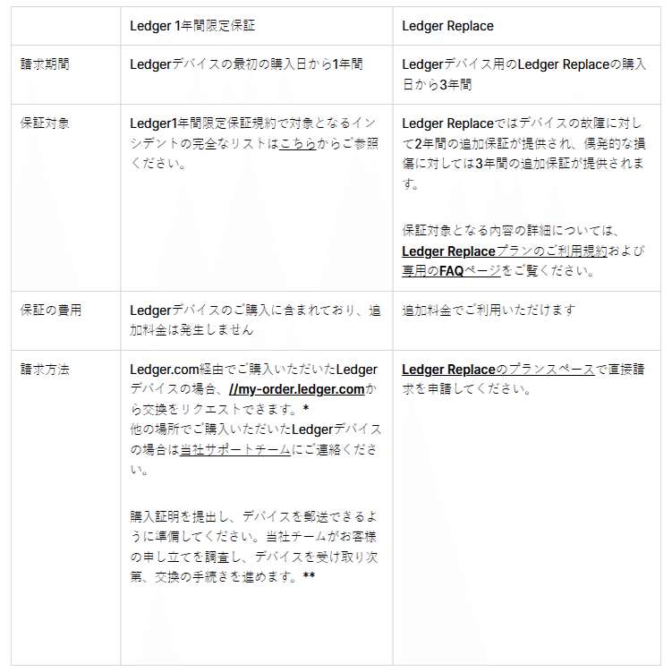 Ledgerの1年間限定保証とLedger Replaceデバイス保護プランの違いの詳細については、以下の表をご参照くださ