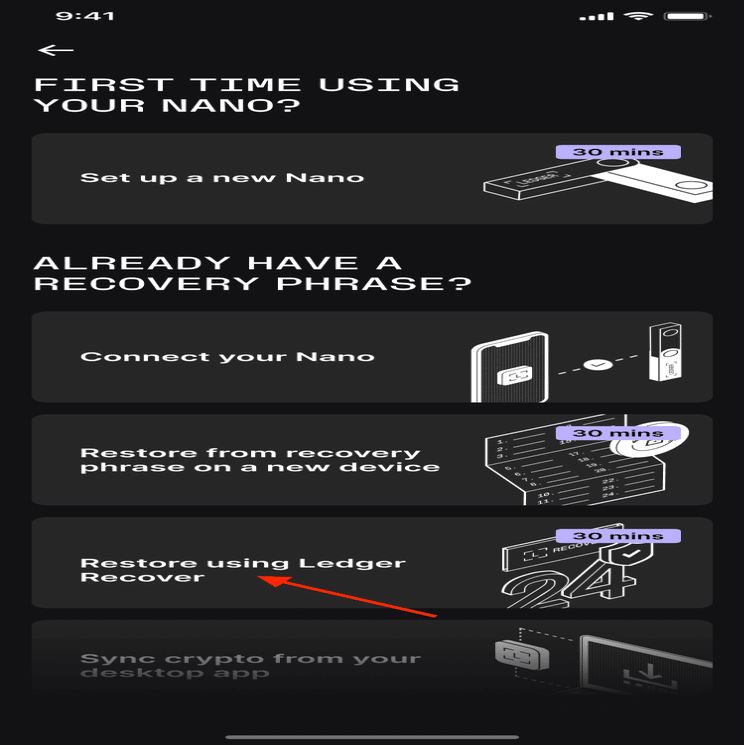 「リカバリーフレーズから復元」ではなく、「Ledger Recoverを使用して復元」を必ず選択してください。リカバリーフレーズから復元を選択した場合は、デバイスを再起動し、Ledger Recoverを使用した復元を選択します。
