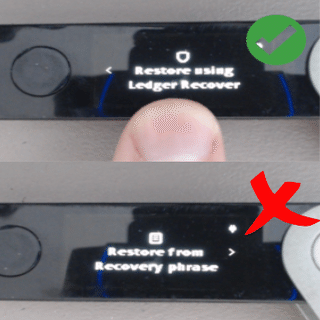 デバイスの両方のボタンを同時に押して、「Ledger Recoverを使用して復元(Restore using Ledger Recover)」を選択する。