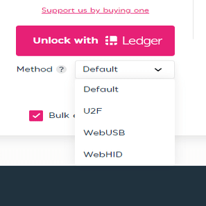 一部のウォレットでは、ユーザーが手動で接続オプションを選択することが可能です。例えば、サードパーティのウォレットであるCardano (ADA) 用のAdaliteの場合、(まもなく非推奨となる)U2F、WebUSB、WebHIDから選択するオプションがあります。この場合、Ledger デバイスを接続するのに最も安定した方法はWebHID となります。