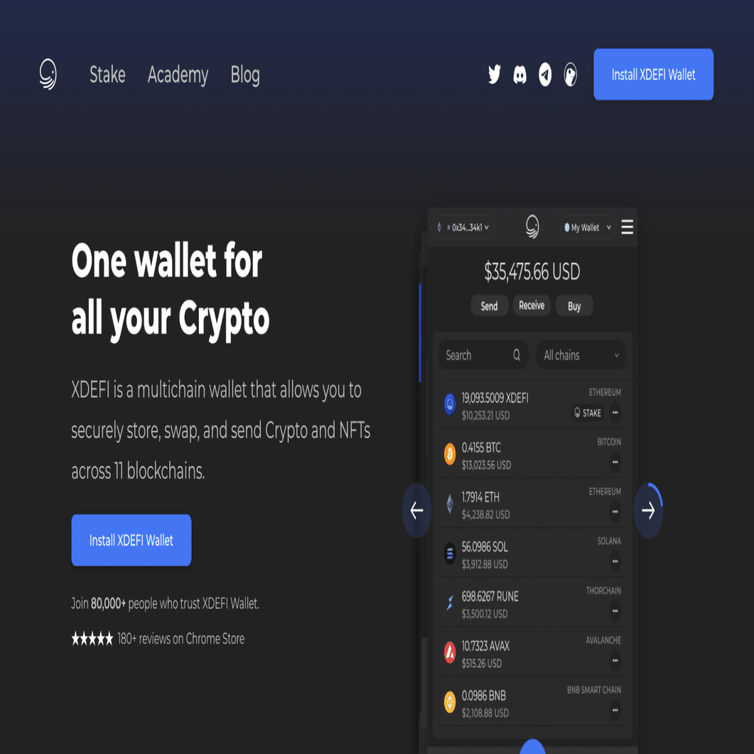 XDEFI Walletはブラウザ拡張機能で、暗号資産の売買、送付や受け取り、スワップ、ステーキングができます。XDEFIでは、Ethereum、Avalanche、Polygon、BNB Chain、Terraなど多数のサポートネットワークから9000以上のdAppsにアクセスし、使用できます。