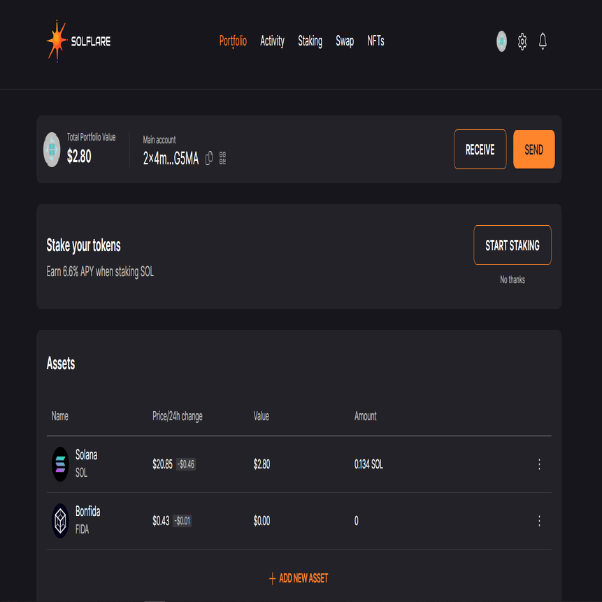二重矢印のアイコンを選択して取引を開始するか、ステーキングボタンをタップしてSOLをステーキングする。