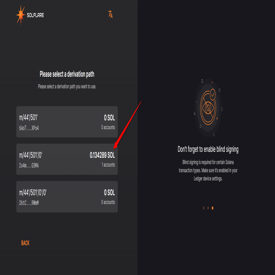 派生パス(鍵の導出データ)にm/44'/501'/0' を選択する。
