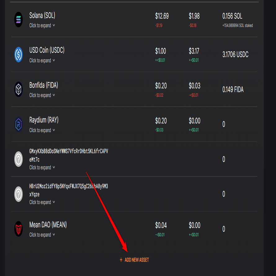 トークンがSolflareに自動的に追加されない場合は、手動で追加する必要がある場合があります。これを行うには、Solflareで+ Add New Assetオプションをクリックし、トークンティッカーを入力してSolflareダッシュボードに追加してください。
