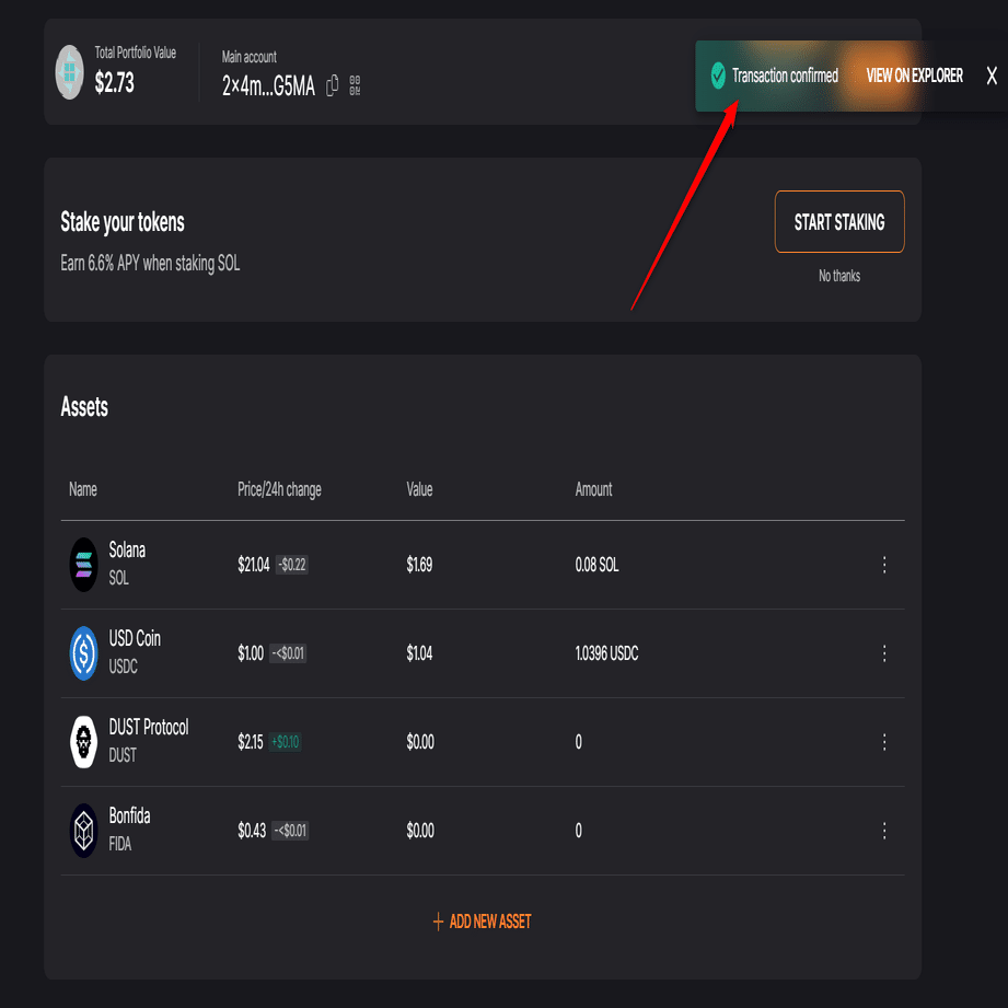 これで完了です。Solanaブロックチェーンでトランザクションが承認されると、トークン残高が宛先アドレスに表示されます。