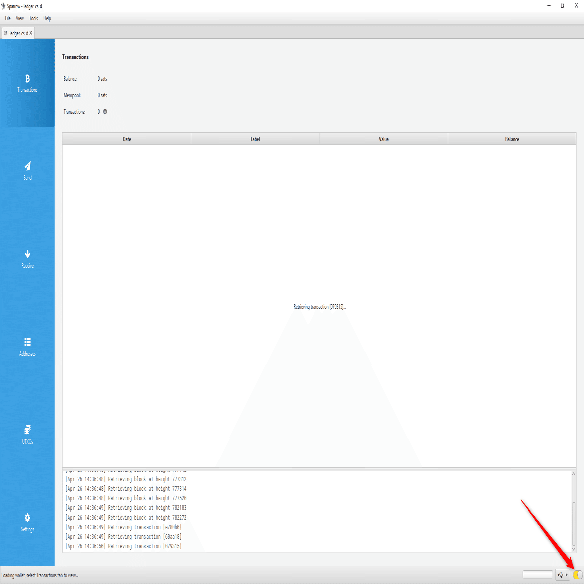 現在アクティブなアカウントにアクセスを試みてもトランザクション履歴が表示されない場合は、アプリケーションの右下隅にあるボタンをクリックして切り替え、Sparrowがブロックエクスプローラーに接続されていることを確認してください。