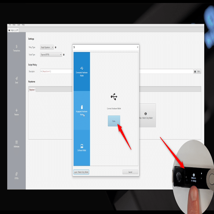 デバイスでBitcoinアプリがまだ開いていることを確認し、「Scan...(スキャン)」をクリックする。