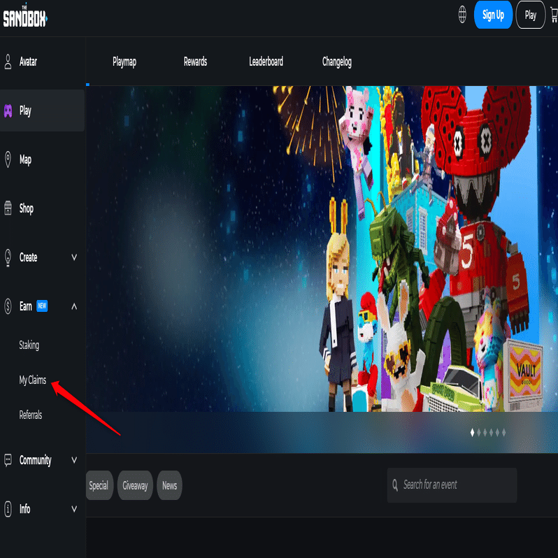 Earn(獲得) -> My Claims(獲得申請)を選択する。