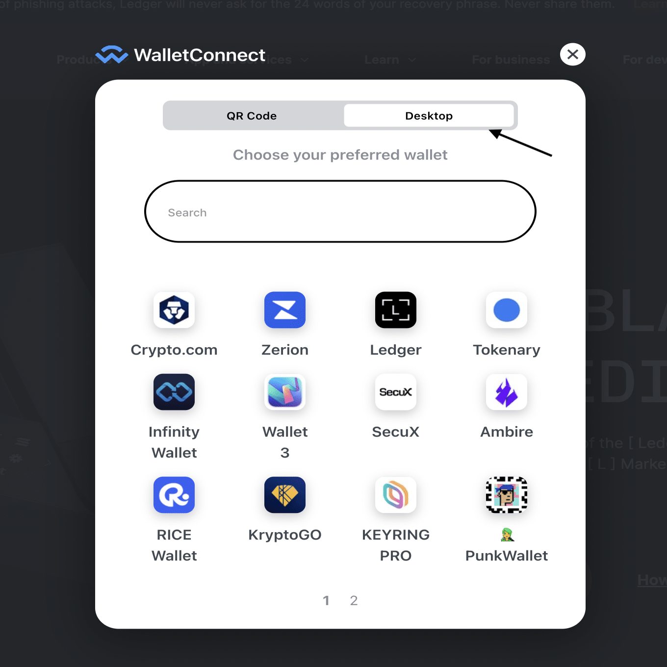 QRコードをスキャンするか、デスクトップでウォレットを接続するオプションが表示されます。デスクトップをクリックすると、多数の人気ウォレットから選択するか、検索バーで探すことができます。