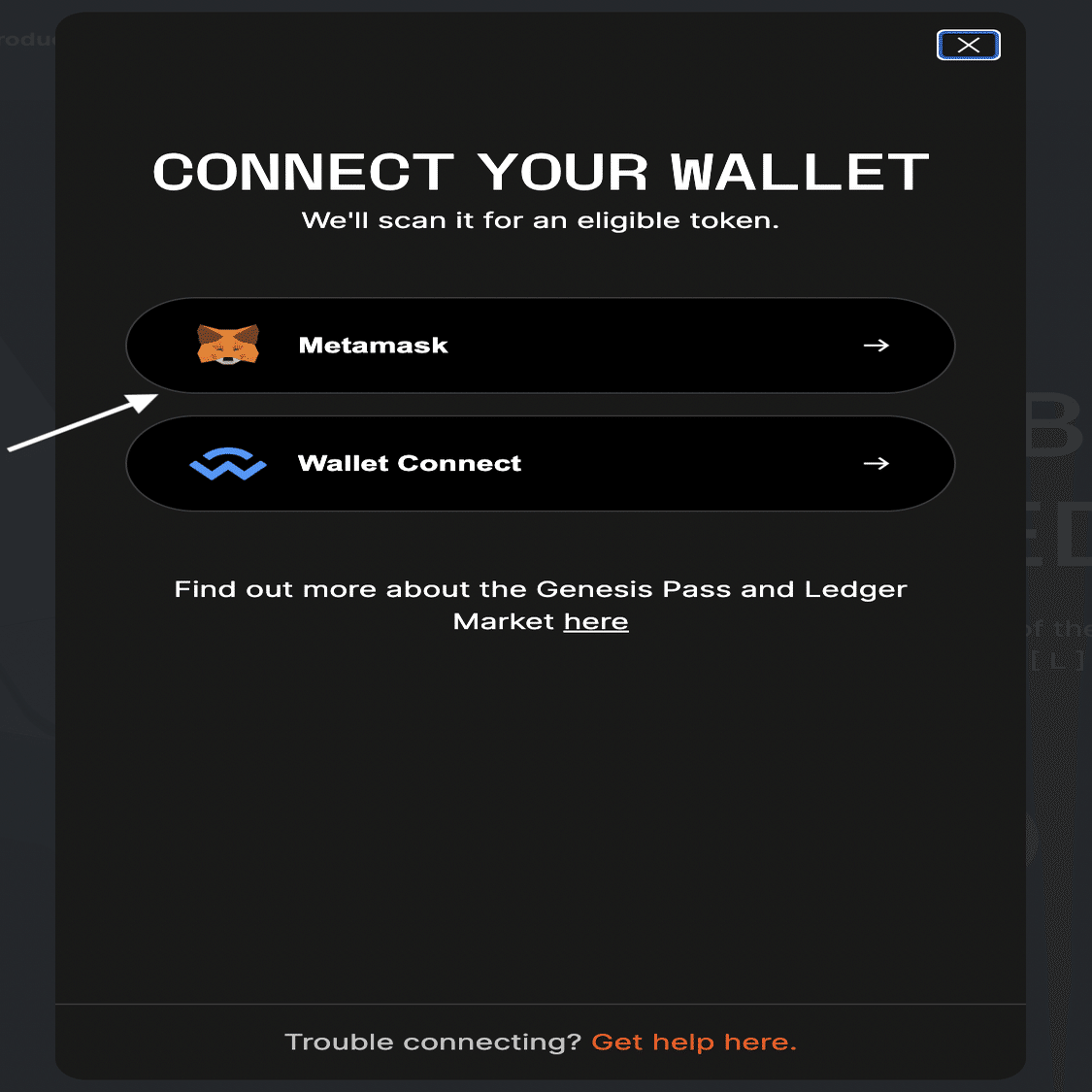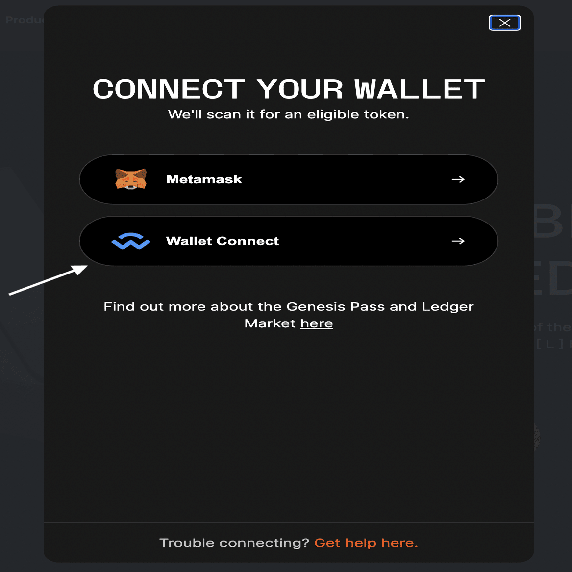➡️https://shop.ledger.com/products/ledger-nano-x-black-on-blackに移動し、「Nano Xを取得する(Claim my Nano X)」をクリックする。対象のGenesis Passをスキャンできるように、ウォレットへの接続が求められます。
