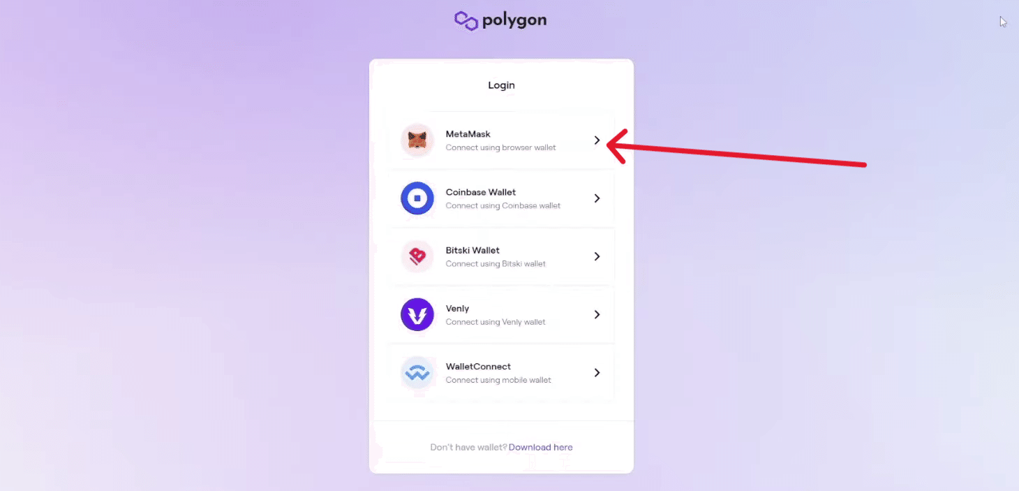 アプリで「Connect to a Wallet(ウォレットに接続する)」を選択し、「MetaMask」を選択するがブラウザで表示されますPolygon Web Wallet website.