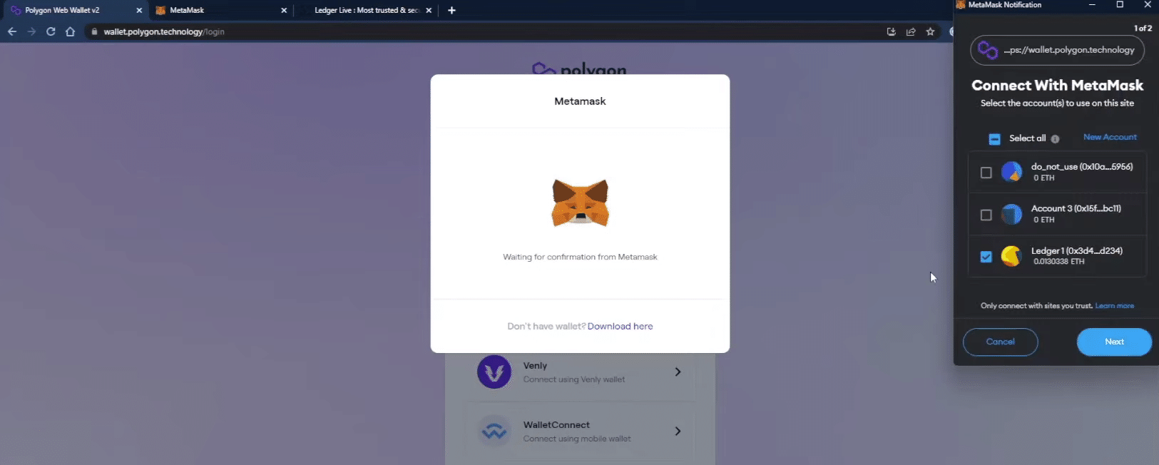 MetaMaskがPolygon Walletアプリに正常に接続されるのを待ちます。