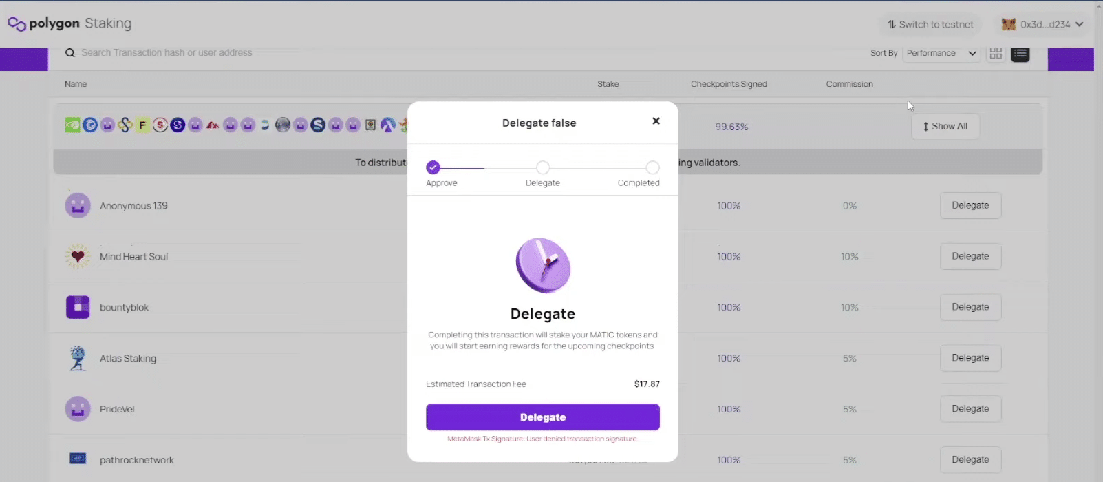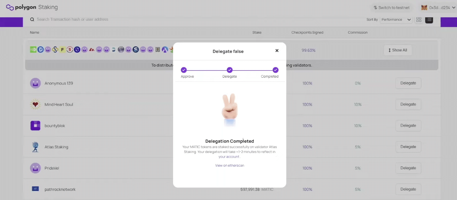 MetaMaskとLedgerデバイスを使用して、トランザクションを確認して確定する。Ethereumネットワーク上でトランザクションが承認されると、アプリに「Delegation Completed(デリゲート完了)」と表示されます。これで完了です。
