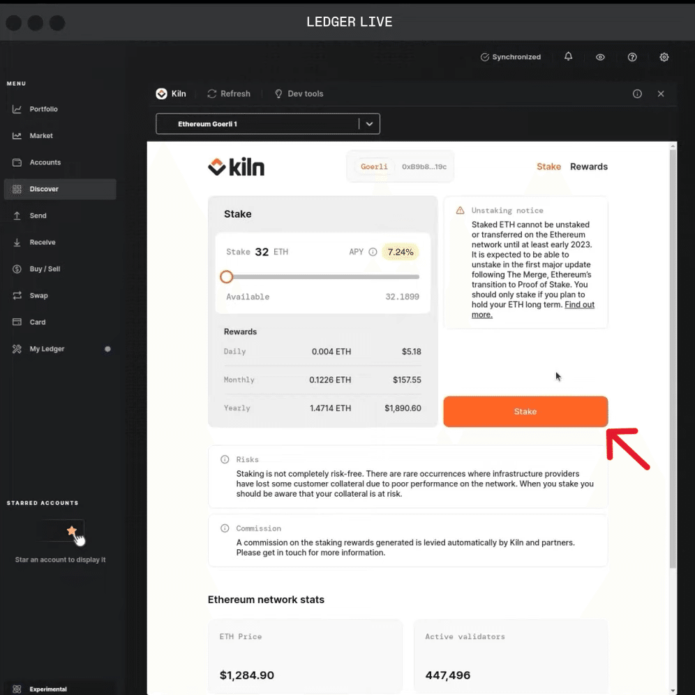 元帳ライブを介してKilnでETHをステーキングする方法は次のとおりです。