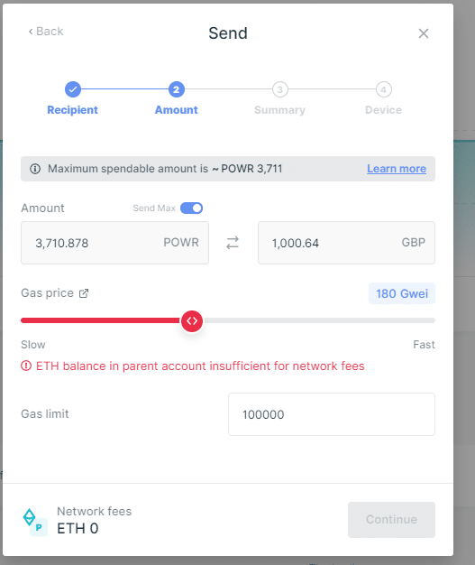 たとえば、イーサリアムアカウントでUSDCトークンを送信すると、ネットワーク料金を支払うために残高にETHが必要です—そうしないと、「親アカウントの残高がネットワーク料金に対して不十分です」というエラーメッセージが表示されます。