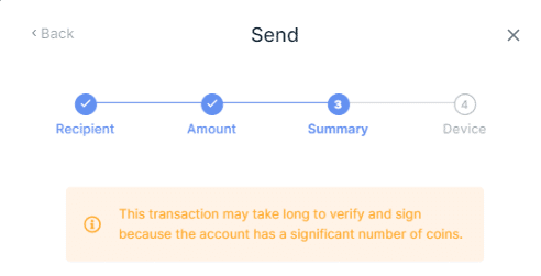Ledger Liveでトランザクションを処理しようとしているが、3番目のステップで「トランザクションの確認と署名に時間がかかる可能性がある」というエラーが表示されたり、4番目のステップでロードが続くというエラーが表示された場合、Ledgerアカウントにあるコインフラグメントが多すぎる可能性があります。
