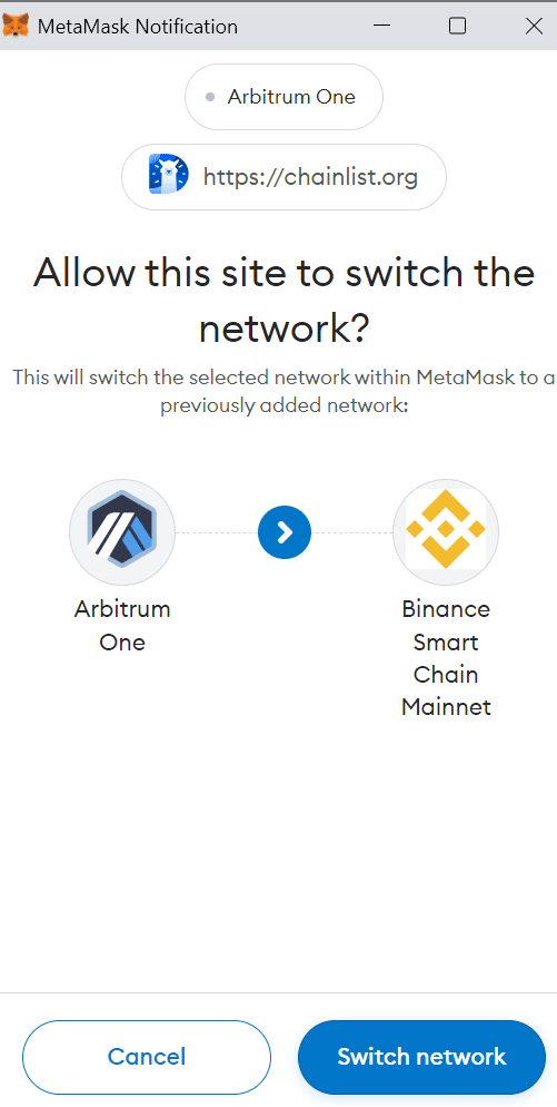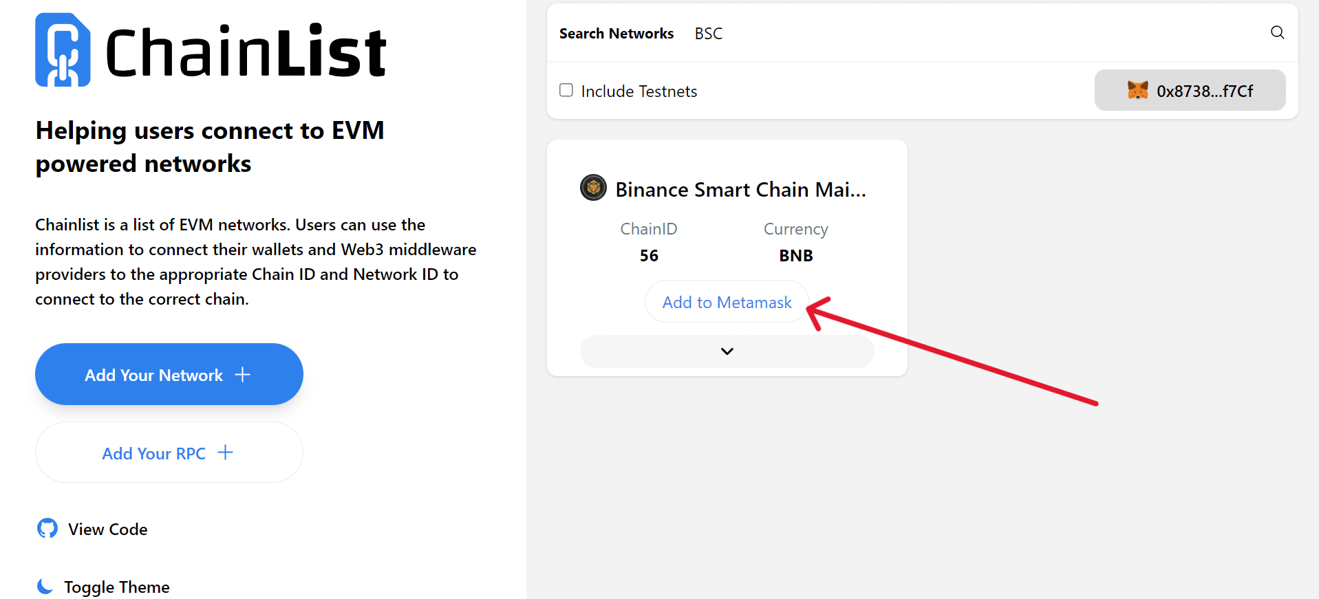 次に、メタマスクアカウントをBSCネットワークに接続します。これを行うには、chainlist.orgに移動します。BSCネットワークを見つけて、[ネットワークの追加]をクリックします。