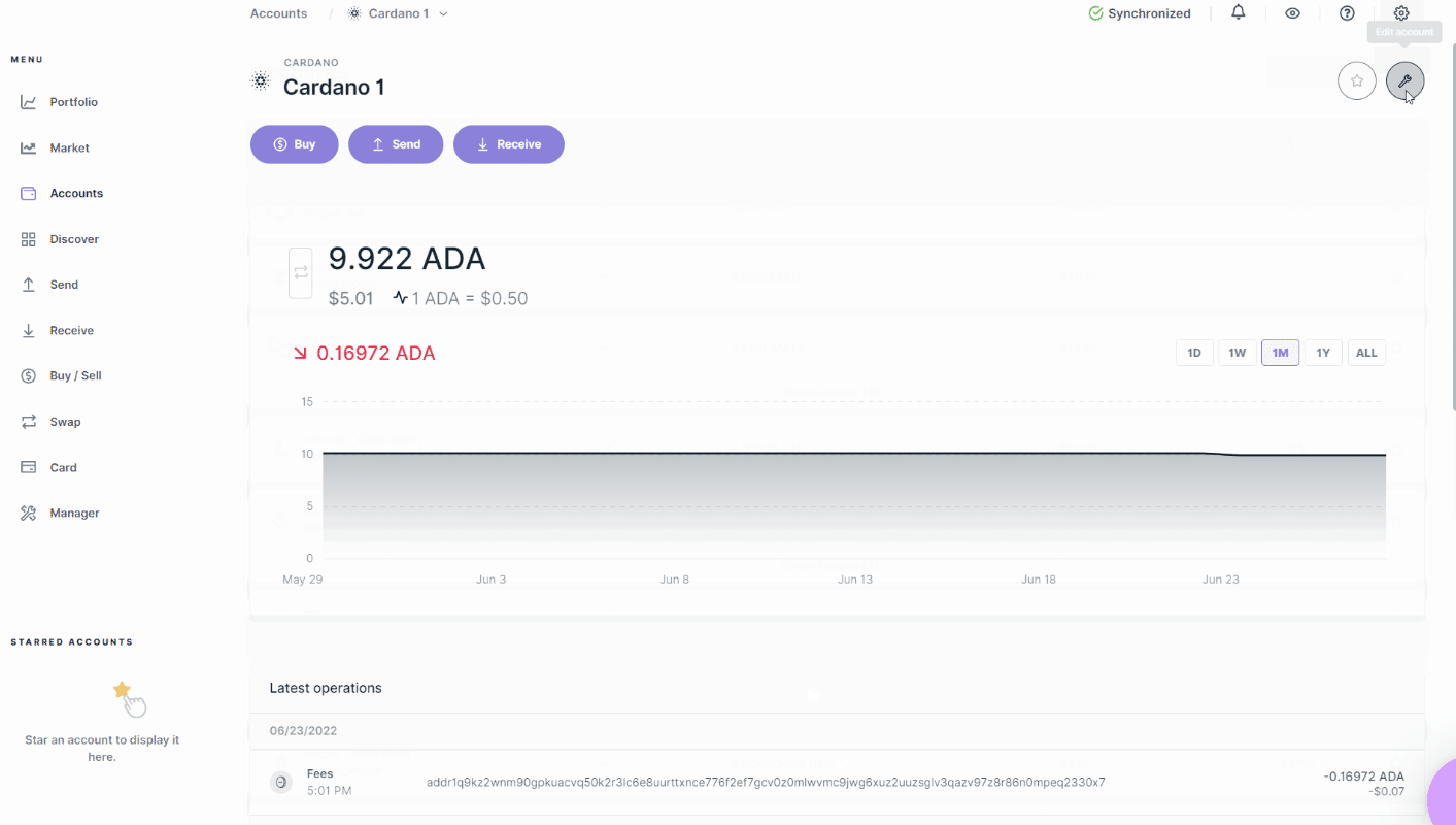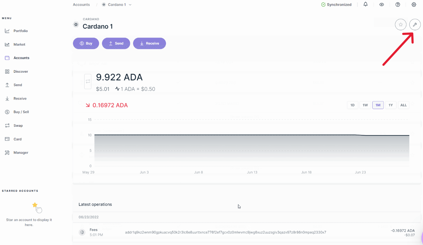カルダノ(ADA)アカウントを選択し、レンチアイコンをクリックします。