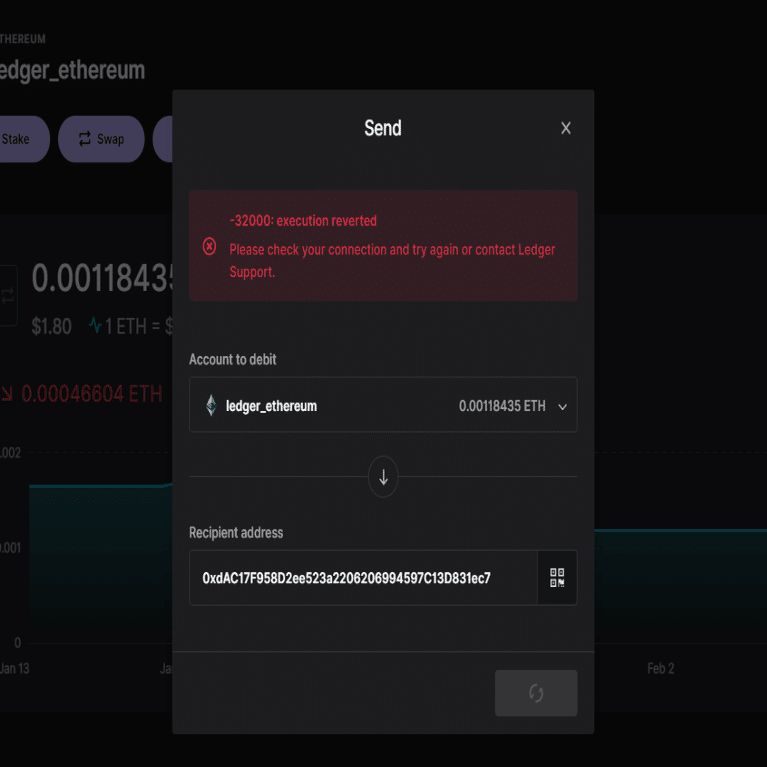 エラー「-32000:実行が元に戻りました」は、レジャーイーサリアムアカウントからETHを送信しようとしたときに発生しますが、トランザクションエラーが発生します。このエラーが発生すると、トランザクションは元の状態に戻りましたされていますので、ご安心ください。