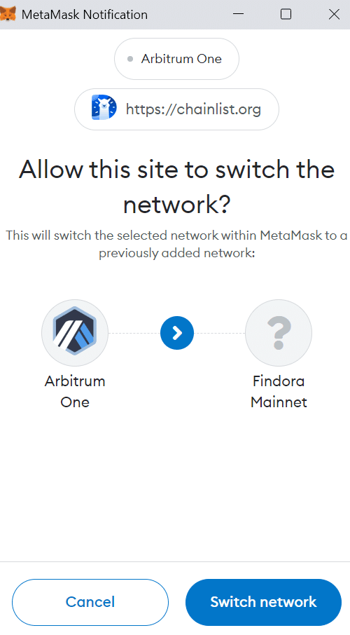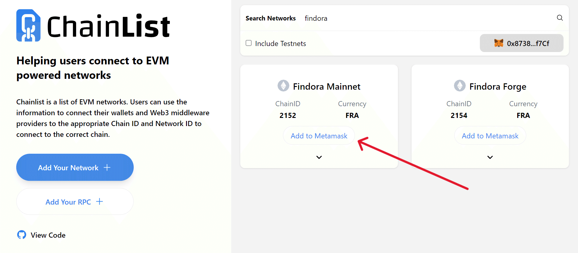 次に、メタマスクアカウントをフィンドラネットワークに接続します。これを行うには、chainlist.org に移動します。フィンドラネットワークを見つけて、[ネットワークの追加]をクリックします。
