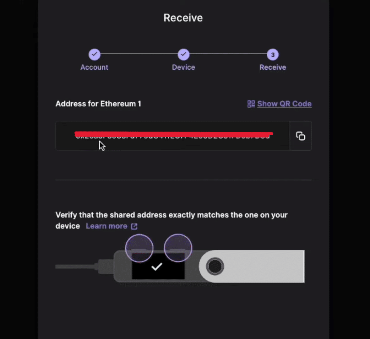 Ledger Liveデスクトップアプリを開きます。受け取りたいアセット口座(私はCrypto.comからEthereumを送信するので、Ethereumアカウントをクリックします)に移動し、「受け取り」を選択します。