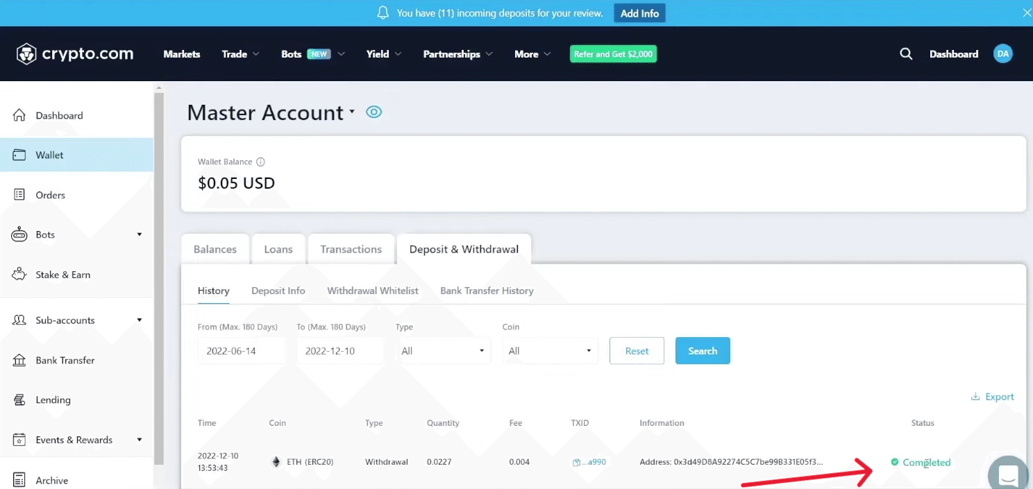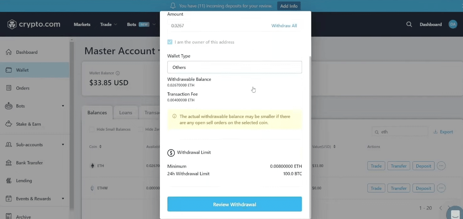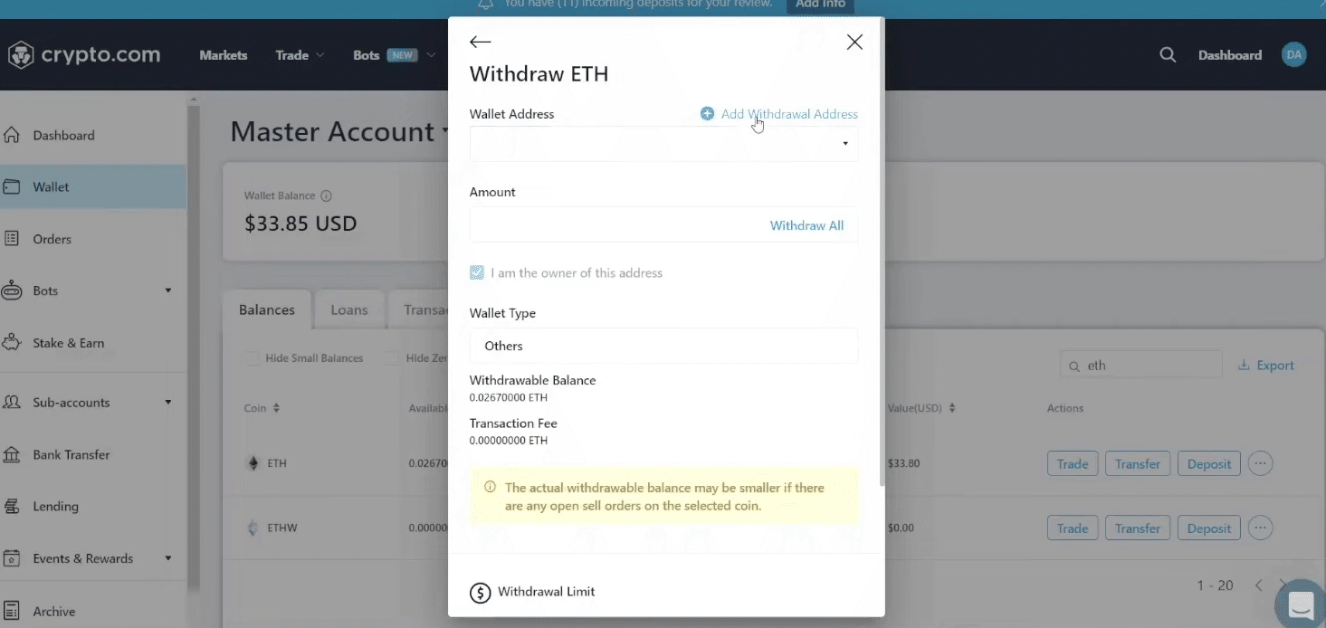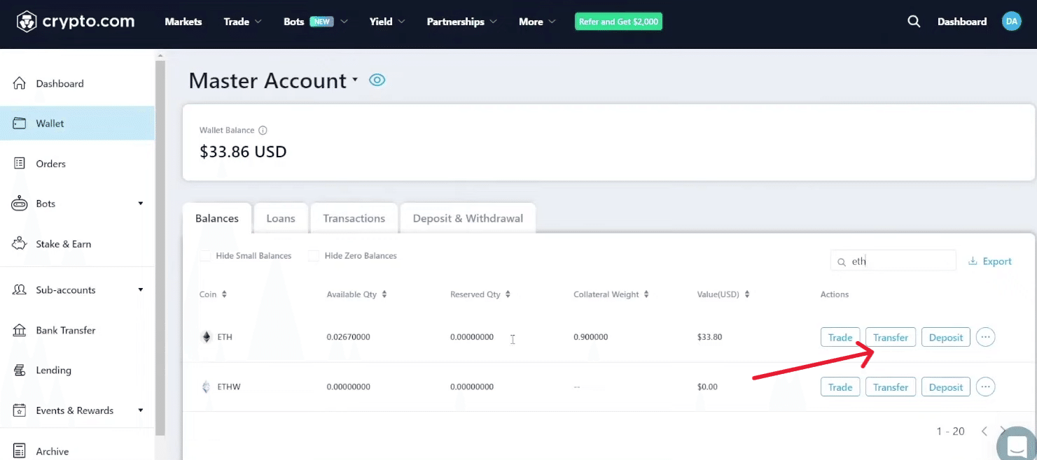 Crypto.comにアクセスして、アカウントにログインします。ページの上部にある「ウォレット」をクリックし、Ethereumアカウントの近くにある「転送」を選択します。