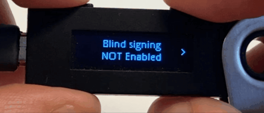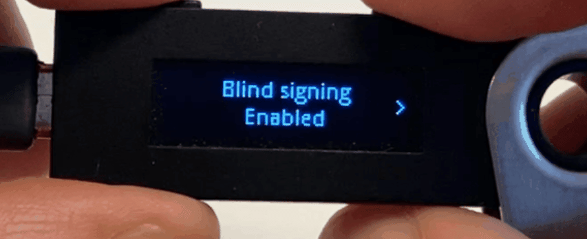 「ブラインド署名」と表示されます。Ledgerデバイスの両方のボタンを押して有効にしてください