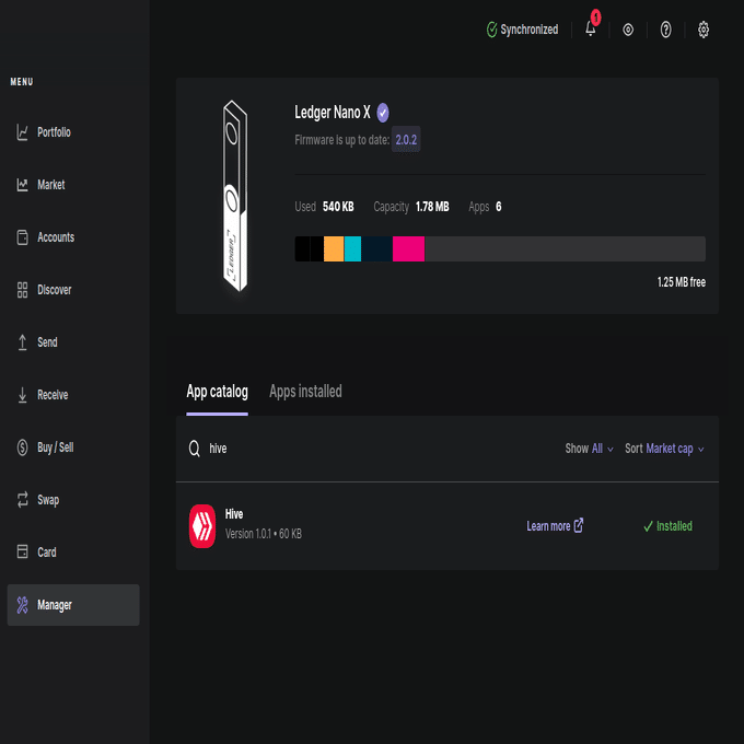 あなたのLedgerデバイスでHiveアプリを開きます。すると、デバイスの画面にHiveのインターフェースが表示されます。