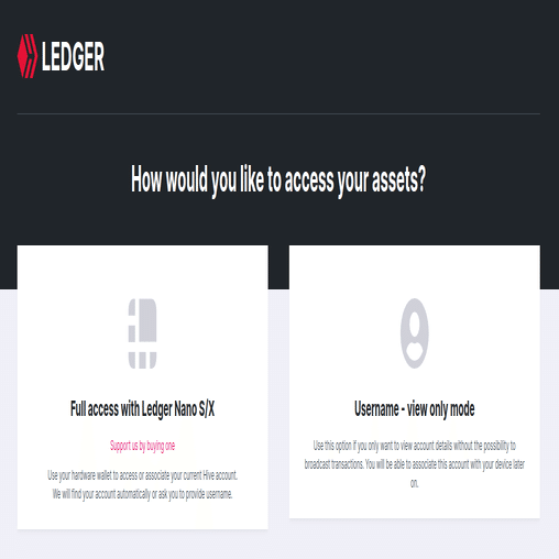 Hive Ledgerウォレットのインターフェースで「Ledger Nano S/Xでフルアクセス」を選択し、「Ledger Liveを使用する」をクリックします。これにより、HiveアカウントとLedgerデバイスが接続されます。