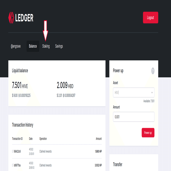 Hiveトークンのステーク解除を行うには、Hive Ledgerウォレットのインターフェースにログインし、「ステーキング」を選択します。