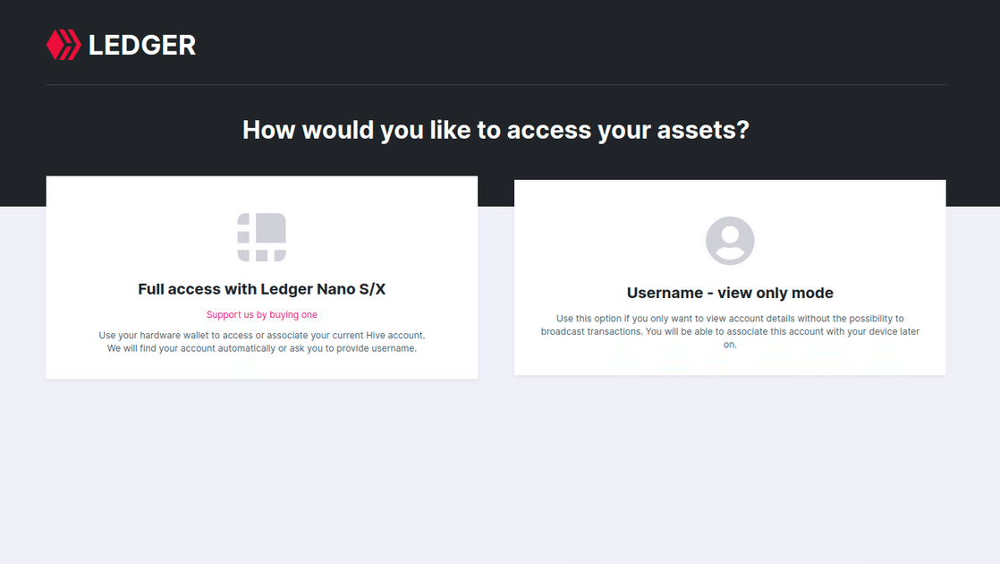 Hive Ledgerアプリにアクセスし、「Ledger Nano S/Xでフルアクセスする」のボタンをクリックします。これをすることでLedgerウォレットがHiveブロックチェーンと接続できるようになります。